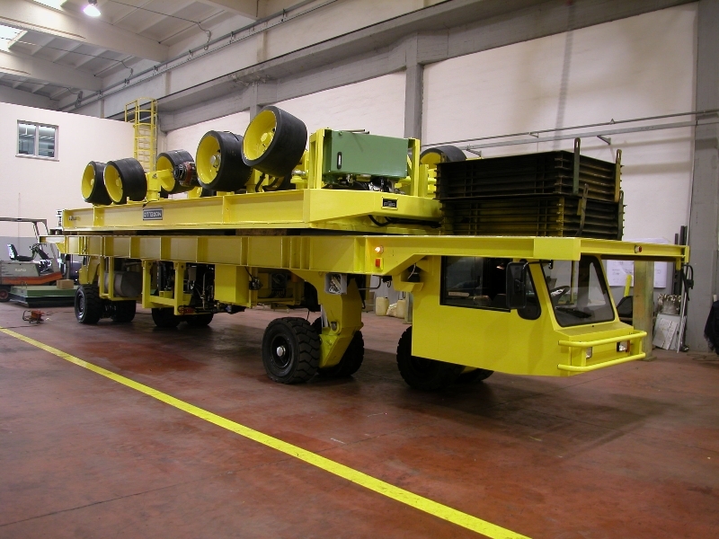 Bei extrem großen und schweren Lasten kann man mehrere, mechanisch miteinander verbundene oder in einem gewissen Abstand voneinander positionierte Fahrzeuge gleichzeitig verwenden.